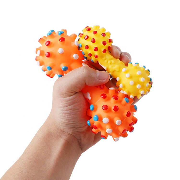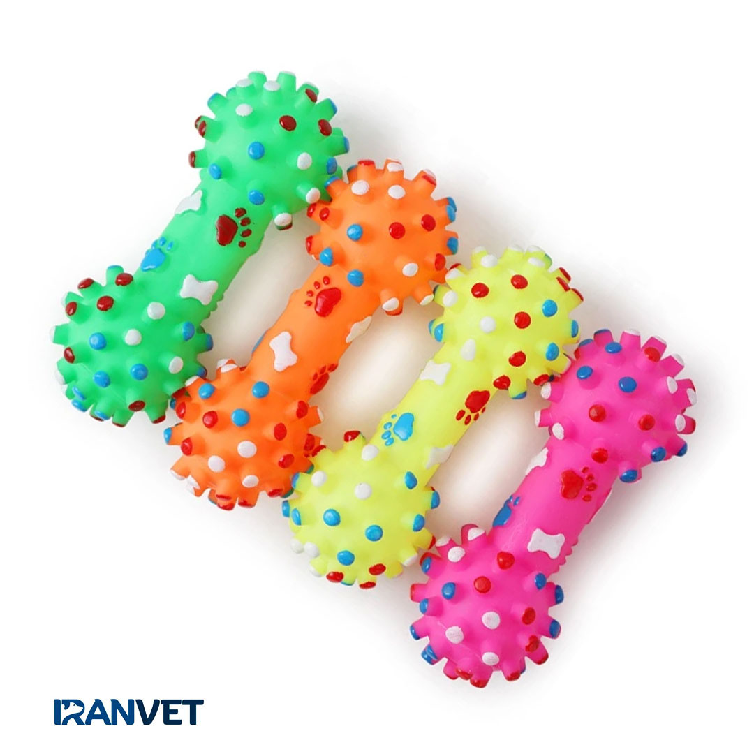 این اسباب بازی وارداتی بوده و از کیفیت ساخت بسیار مطلوبی برخوردار است و سرگرمی خیلی خوبی برای حیوانات خانگی مثل سگ وگربه ها میباشد . این دمبل ها صدادار بوده و دارای رنگ های متنوع و جذابی میباشد و جنس آنها از لاستیک قابل انعطاف بوده که در مقابل دندان های محکم سگ ها بسیار مقاوم است.