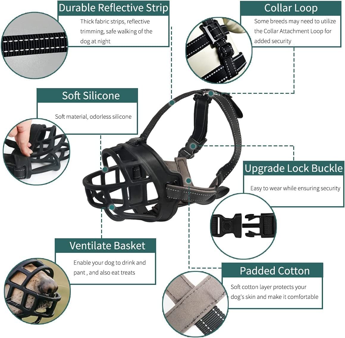 این پوزه بند دارای سایز های مختلف و مناسب برای سگ های کوچک تا بزرگ میباشد .این پوزه بند از سیلیکون نرم و با دوام و بدون آسیب برای پوست بینی سگ ساخته شده است و دارای محل آزاد برای تنفس و له له زدن سگ بوده و باچهار بند از جهات مختلف قابلیت محکم سازی دارد .